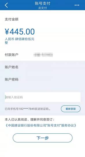 2.填写“账户姓名”、“账户密码”,输入手机收到的“短信验证码”,点击“下一步”,即可开通账号支付并完成订单支付。